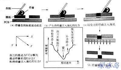 當(dāng)刮刀以一定速度和角度向前移動(dòng)時(shí),對(duì)焊錫膏產(chǎn)生一定的壓力,推動(dòng)焊錫膏在刮板前滾動(dòng),產(chǎn)生將焊錫膏注入網(wǎng)孔(即模板開口)所需的壓力,焊錫膏的粘性摩擦力使焊錫膏在刮板與網(wǎng)板交接出產(chǎn)生切變,切變力使焊錫膏的粘性下降,從而順利地注入網(wǎng)孔;當(dāng)刮板離開模板開口時(shí),焊錫膏的粘度迅速回復(fù)到原始狀態(tài)。下圖為焊錫膏印刷原理示意圖:
