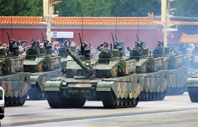 新型坦克方隊位列裝備方隊之首,是唯一呈箭形通過天安門的方隊。這是99A式坦克參加預演(8月23日)。